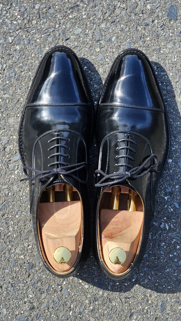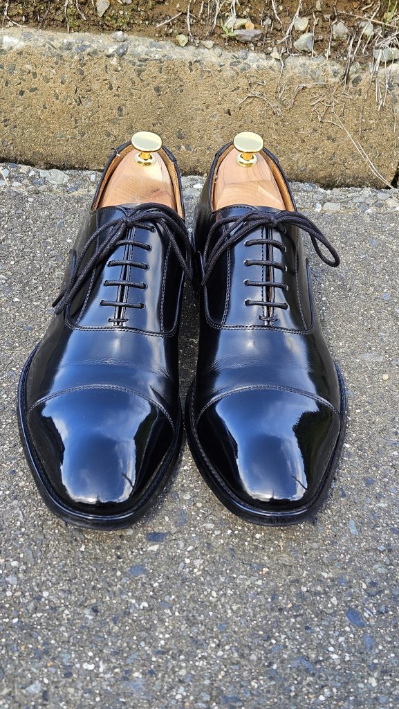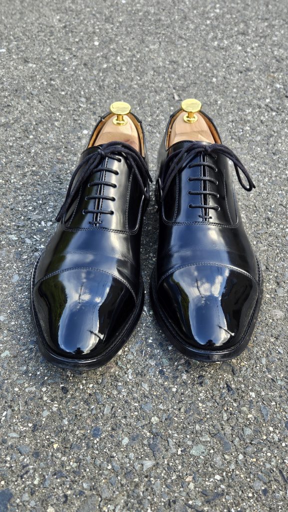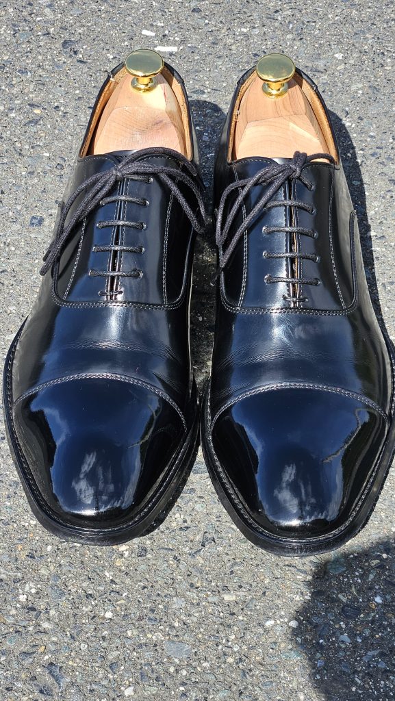 今回は、No.4のブログのように靴の変化過程の写真はありません。その代わり、靴に鏡面磨きを施した場合の外での写真を複数枚載せています。快晴か曇り空か、周りの明るさによって全く同じ靴ですが、靴の表情も変わってきます。ぜひご覧ください。